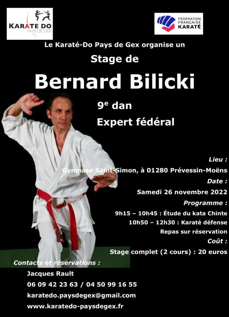 Stage BILICKI le 26.9.2022 20.11.2022 Yves-Alain THÉVOZ Stage de karaté traditionnel et karaté défense à Prévessin-Moëns (F). Programme : 9h15-10h45 Etude du kata Chinte 10h50-12h30 Karate défense Tarif : 20€ Vie du club